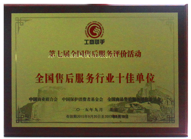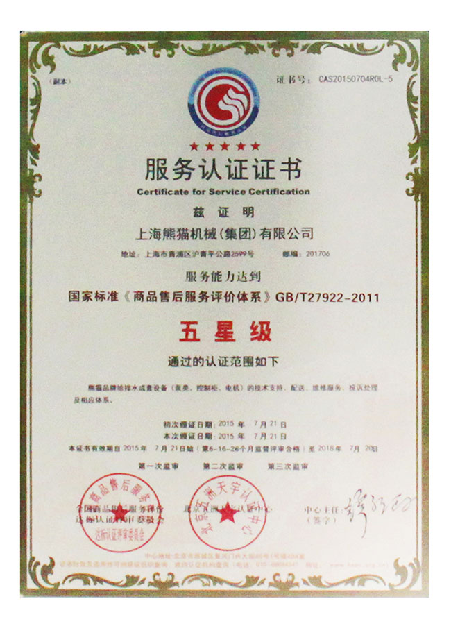 2015年9月20日,第七屆全國售后服務(wù)評價活動發(fā)布會在北京舉行,會上我們上海熊貓機(jī)械(集團(tuán))有限公司榮獲“全國售后服務(wù)行業(yè)十佳”稱號;并在會上由中國輕工業(yè)聯(lián) 合會會長步正發(fā)為我們熊貓頒發(fā)《商品售后服務(wù)評估體系》五星級認(rèn)證證書。